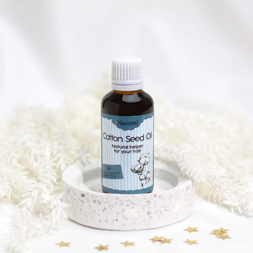 Olej z nasion bawełny Nacomi to 100 % naturalny olej, bez żadnych dodatków! Doskonale sprawdza się jako preparat pielęgnacyjny skóry i włosów. Posiada właściwości zmiękczające. Bogata dawka NNKT (niezbędnych nienasyconych kwasów tłuszczowych) działa przeciwzapalnie i przeciwalergicznie. Duża zawartość witaminy E przyśpiesza regenerację i eliminuje szkodliwe działanie wolnych rodników.
