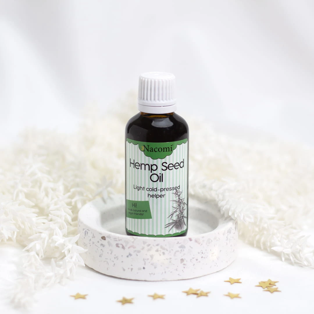 Olej konopny od Nacomi pochodzi z upraw ekologicznych. Tłoczony na zimno i nierafinowany zachowuje swoje oryginalne właściwości takie jak kolor i zapach. Pozyskiwany z nasion konopi siewnej nie posiada właściwości narkotycznych. W 75% składa się z niezbędnych nienasyconych kwasów tłuszczowych. Zawiera również przeciwutleniacze, proteiny, aminokwasy, karoten, fitosterole, fosfolipidy, minerały oraz witaminy. Nie przetłuszcza włosów i skóry, a dzięki swojej bogatej formule utrzymuje je w wyśmienitej kondycji.
